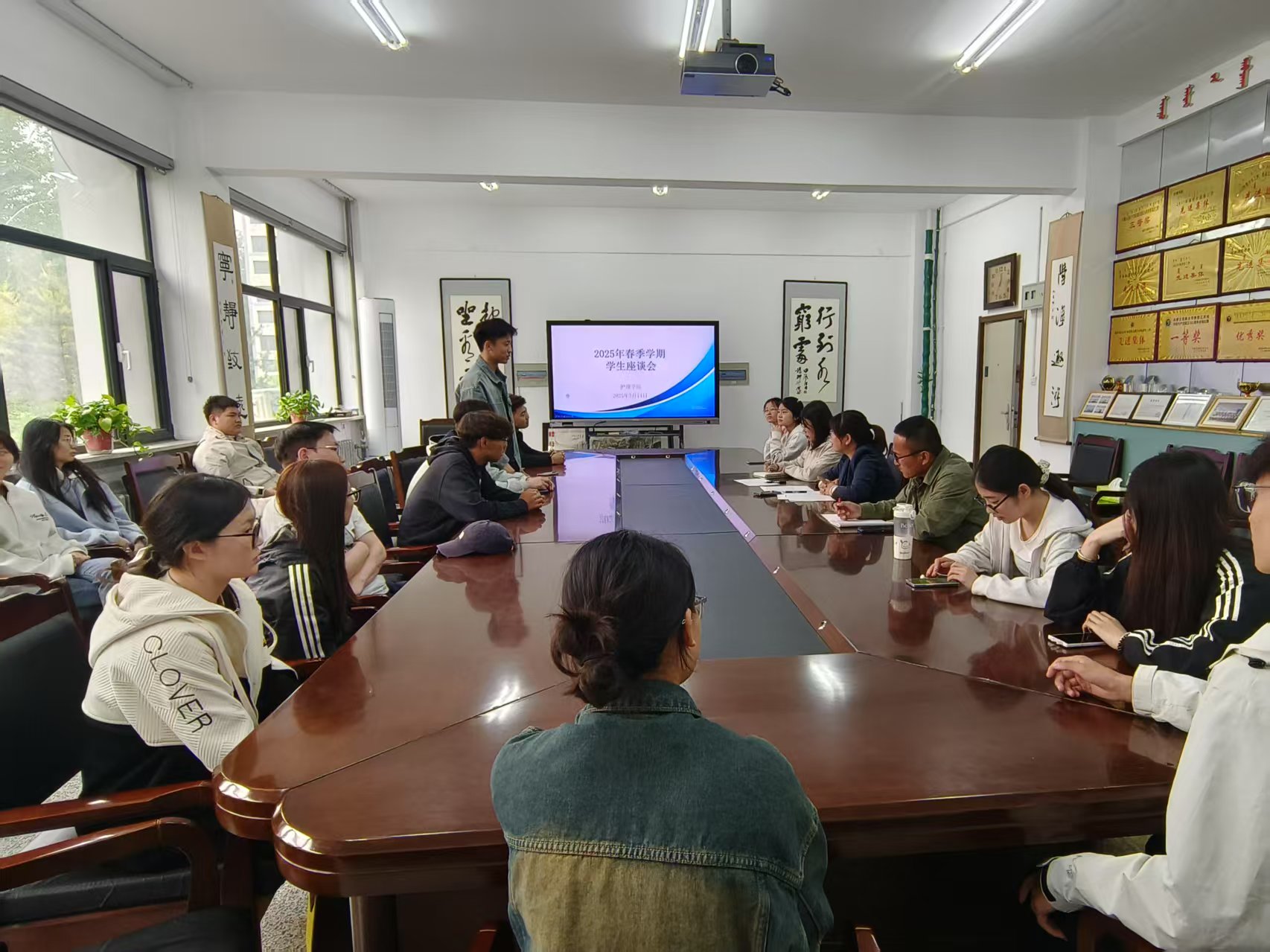 5月14日中午,护理学院在医学楼229会议室召开2025年春季学期期中教学检查学生座谈会,学工办主任包宝林、专任教师包敏及20名学生代表参加会议。会议由副院长耿婉如主持。