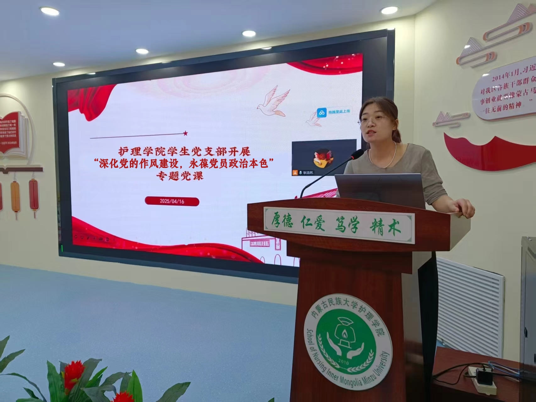 4月16日,护理学院学生党支部召开党员大会,开展深入贯彻中央八项规定精神学习教育专题党课。学生党支部书记李宏霞以《深化党的作风建设,永葆党员政治本色》为题进行党课,本次党课以线上线下结合的形式开展,学生党支部党员33人参加党课。
