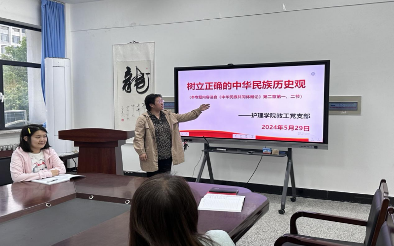 护理学院教工党支部于5月29日下午4:30,在西拉木伦校区医学楼229室召开教工党员大会,由党支部书记王文燕讲党课。本次党课的主题是“树立正确的中华民族历史观”。本次专题党课学习了中华文明的五大突出特性,中华民族共同体的本质特征和中国共产党执政的必然性。