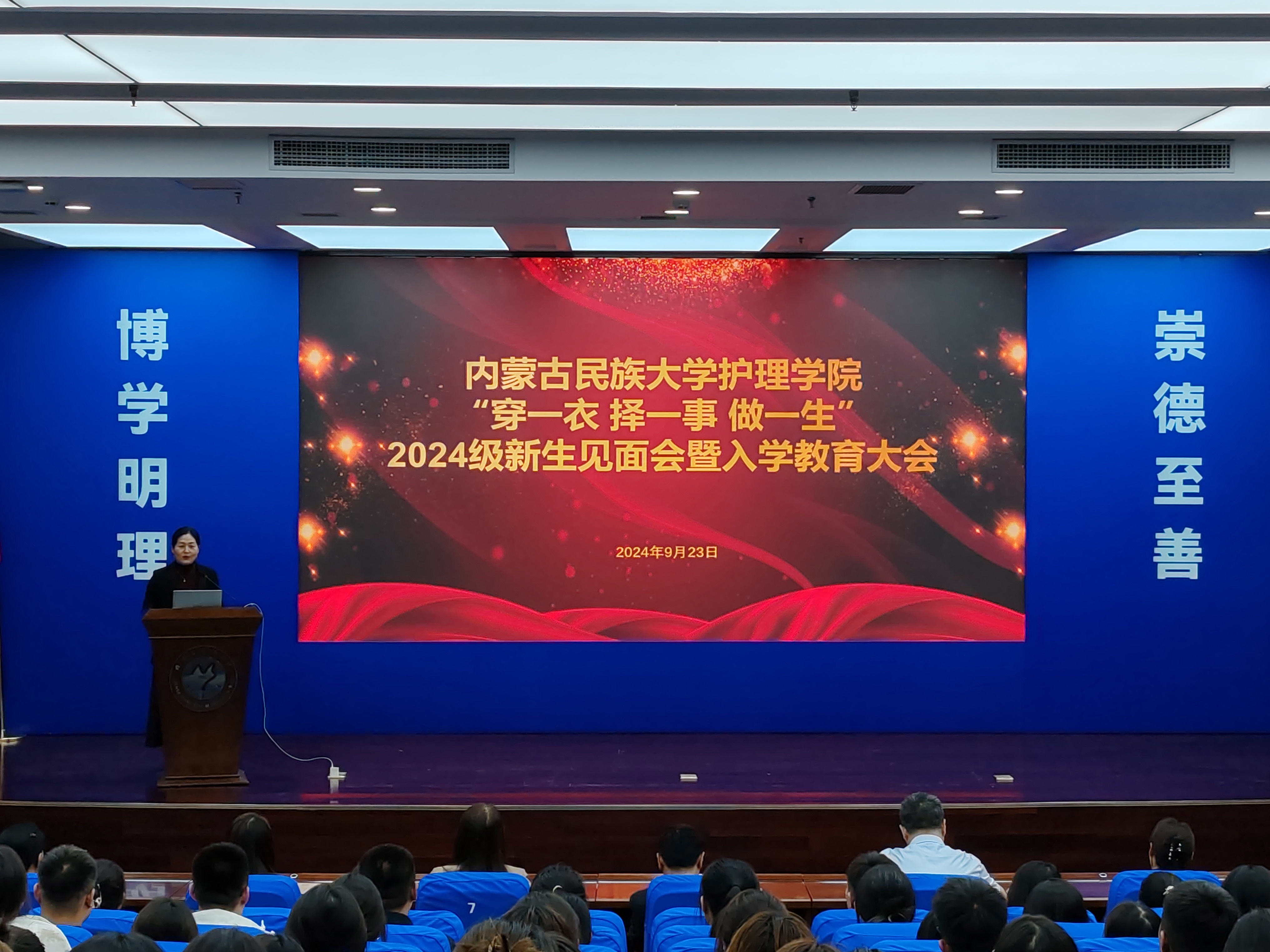 2024年9月23日,在图书馆大报告厅,内蒙古民族大学护理学院召开“穿一衣 择一事 做一生”为主题的2024级新生见面会暨入学教育大会。学院领导班子、全体教职工及2024级硕士研究生和本科生共240余人参加会议,会议由学院党委副书记包明兰主持。