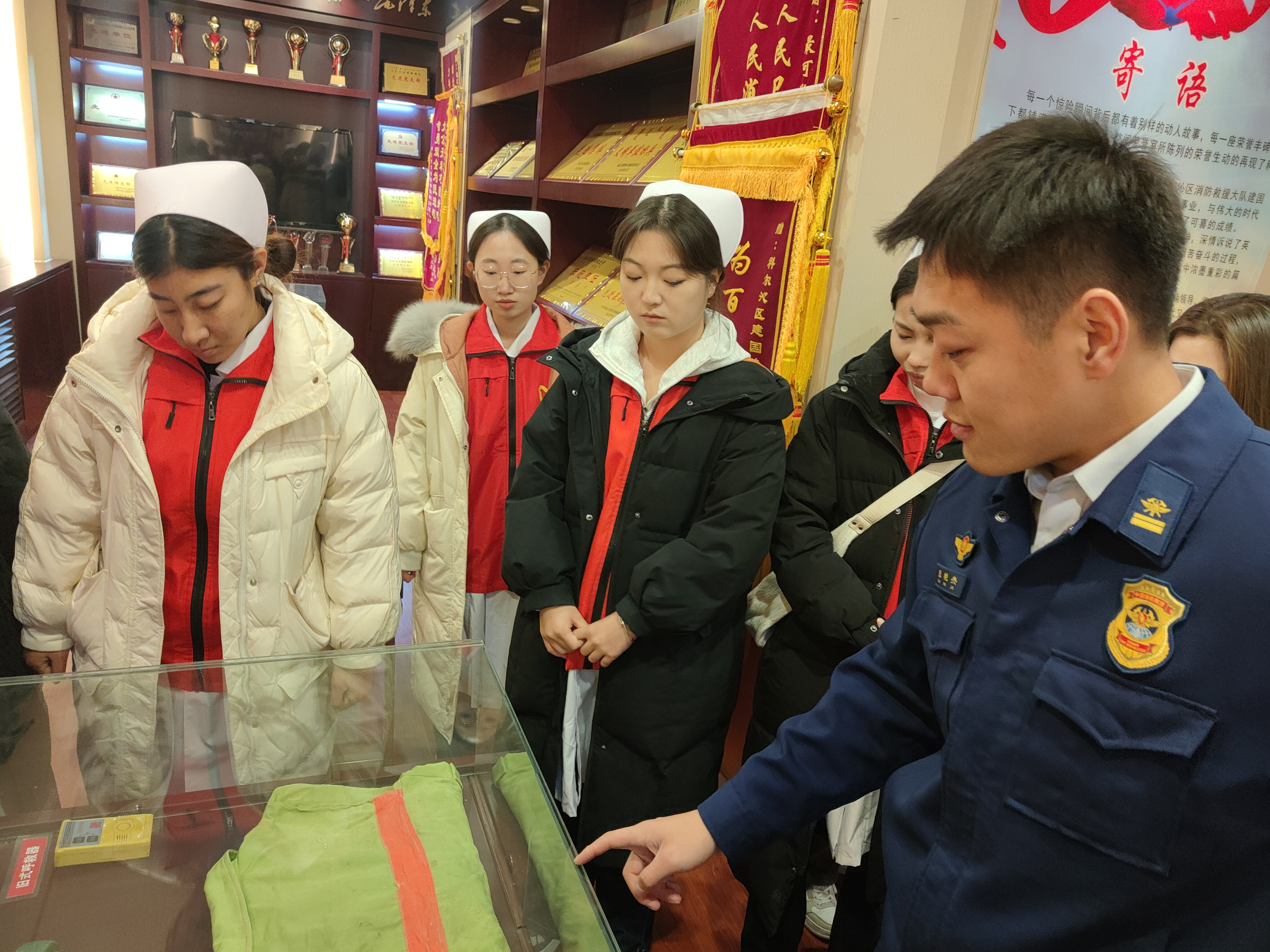随后消防站班长张艳杰带领同学们一同参观消防历史展厅,通过陈列的消防装备、消防英雄事迹、火灾事故案例等内容进一步了解了消防员们在不同历史时期的工作场景和英勇事迹,让同学们更加深刻理解消防工作的严峻性和必要性。