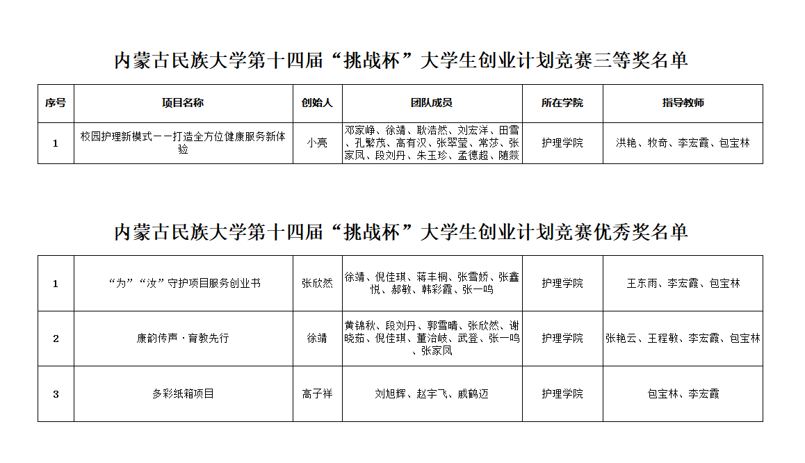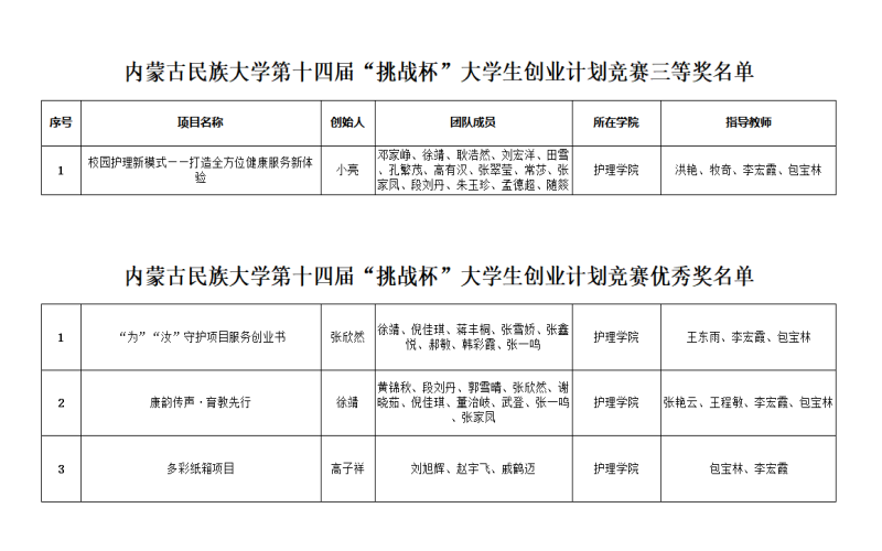 12月12日下午,内蒙古民族大学第十四届“挑战杯”大学生创业计划竞赛表彰总结大会在图书馆大报告厅举行。本次表彰中,护理学院参赛项目取得优异成绩。小亮等同学的“校园护理新模式——打造全方位健康服务新体验”项目荣获三等奖;张欣然等同学的“‘为’‘汝’守护项目服务创业书”、徐靖等同学的“康韵传声·育教先行”项目以及高子祥等同学的“多彩纸箱”项目荣获优秀奖。