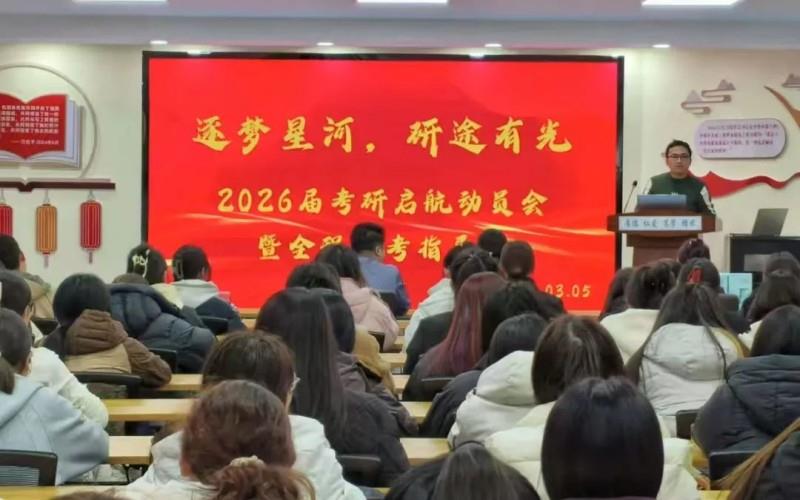 为了进一步加强学风建设,提升学习帮扶力度,确保考研学生能够明确目标、合理规划、高效备考,学院于3月5日在西拉木伦校区医学楼201室召开了"逐梦星河,研途有光"——2026届考研启航动员会暨全程备考指导会。学院党委副书记包明兰,海天考研机构讲师熊世才、李秋、元錦森及90余名有考研意向的学生参与。会议由学工办主任包宝林主持。