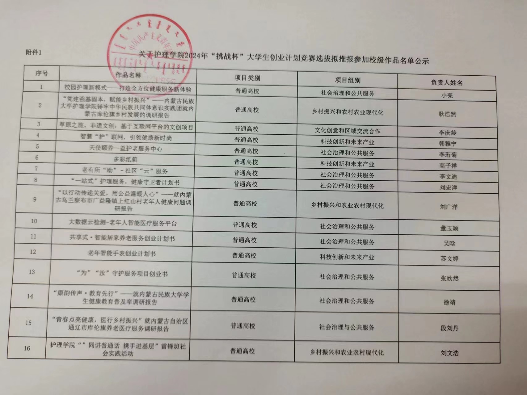 根据《关于举办内蒙古民族大学第十四届“挑战杯”大学生创业计划竞赛的预通知》规定,经学院组织专家线上评审,按评审结果拟推荐护理学院2024年“挑战杯”大学生创业计划竞赛作品16件,参加内蒙古民族大学第十四届“挑战杯”大学生创业计划竞赛。现将作品名单公示如下:公示时间为2024年4月23日-4月29日。公示期间如有异议,请向学院团总支处反馈。(电话:0475-8314309,电子邮箱:mindalhx@163.com)
