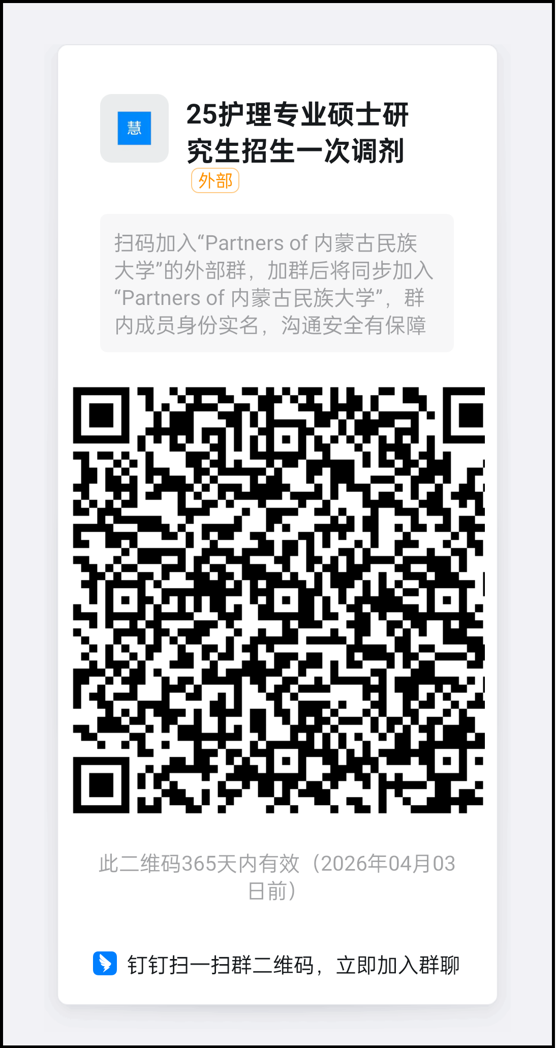 为方便考生及时了解我院调剂复试相关信息,顺利平稳完成调剂复试工作,请各位调剂考生扫描下方二维码入群,或搜索钉钉群号: 122725002372。入群后请将群昵称改成:姓名+手机号。
